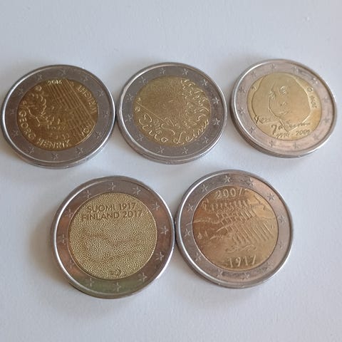 Kokoelma 2 euron kolikoita vuosilta 2010-2016. Kolikot ovat kaksivärisiä, ulkoreuna hopeanvärinen ja keskusta kultainen. Sopivat keräilyyn tai käyttöön.
