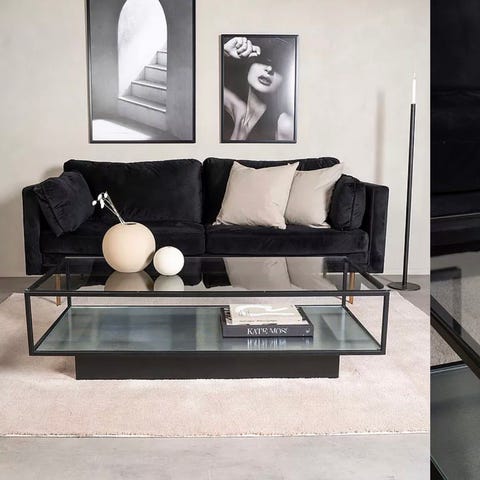 Tyylikäs sohvapöytä, joka viimeistelee olohuoneen ylellisen ilmeen. Kullanvärinen metallirunko ja lasinen pöytälevy.