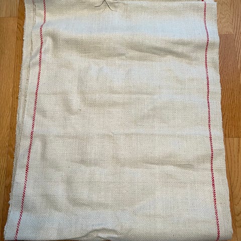 Pellava kangas n. 120 x 185. Toista päätä ei ole neulottu. Karheahkoa kangasta.