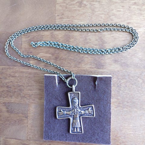 Ristin koko 4,5 x 4,5 cm, 5 cm lenkin kanssa. Riipusketju n. 65 cm. Puhdistusta/kiilloitusta vailla, muuten lähes käyttämätön. Postitus mahdollinen. Myös toimitus Vantaa/Helsinki tarvittaessa omien menojen mukaan.