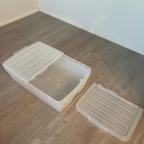Punainen, ilmeisesti nailonkankaalla päällystetty rahi/säilytyslaatikko/lelulaatikko/vuodevaatelaatikko/sängynpaatylaatikko; ulkopituus n 81 cm, leveys 42 ja korkeus 43 cm. Pieni tahra kannessa, en tiedä lähteekö pois. Laatikon pystyy taittelemaan litteäksi - säästää tilaa!