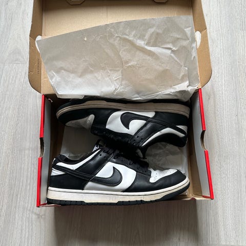 Käytetyt Niken dunk panda low kengät. Koko 45 eli UK 10, cm 29. Kantapäät sisältä ehjät, muutoin käytön jälkiä. Pohjat kantapään alta hieman kulahtaneet (kuva).