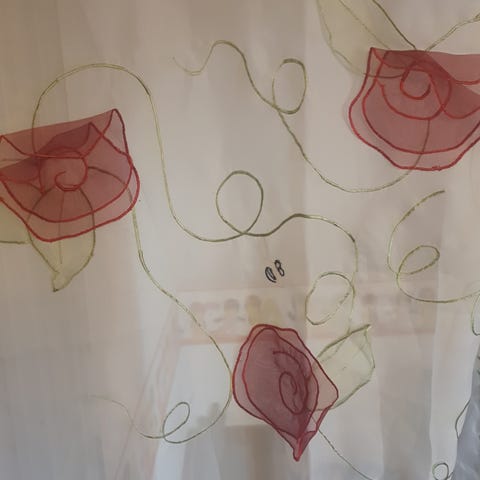Kuvanmukaiset, kauniin vaalean beigen väriset läpikuultavat verhot.