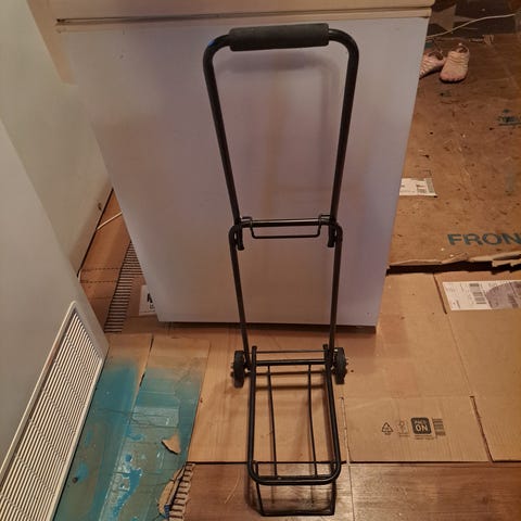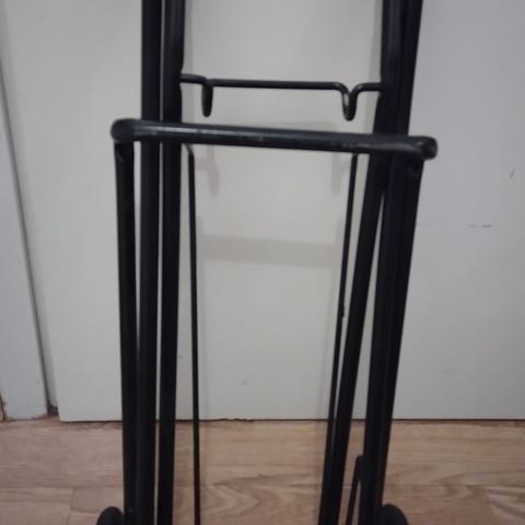 Taitettava, vanhempi metallinen kärry, jossa on kestävät pyörät. Sopii erinomaisesti tavaroiden kuljettamiseen esim. rompetoreilla, laivalla ym. Helppo säilyttää ja kuljettaa taitettavan rakenteensa ansiosta.