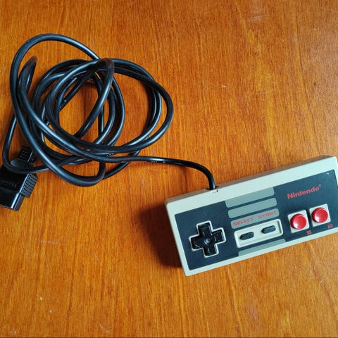 Aidot ja alkuperäiset 8 bittisen Nintendon ohjaimet. Nostalgista fiilistä tuovat myös hampaan jäljet molemmissa ohjaimissa. Toisen ohjaimen johtoa teipattu. Ravistaessa kuuluu jotain pientä helinää, mutta joskus viimeksi kun ohjaimia on käytetty, niin molemmat taisivat toimia. En kuitenkaan pysty takaamaan kuinka hyvin toimivat.