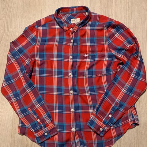 Tyylikäs, pitkähihainen, 100% viskoosipaita. Koko ehkä L. Kai-kai noin 51cm, o-h noin 75cm. Pieni pystykaulus, kauniit luunapit niskan puolella. Rypistynyt kaapissa, hyvä, käytetty kunto.