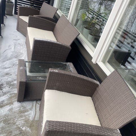 5 osainen rottinkinen puutarhakalustesetti jossa pöytä + 4 nojatuolia.