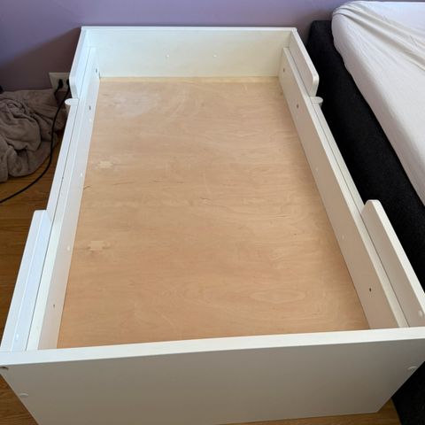 Myydään Muurame Jolla jatkettava sänky ja Lippo lelulaatikko. Sängyn pituutta voi säätää lapsen kasvaessa. Patjamitta on 75 x 130–200 cm ja ulkomitan säätö 135–208 cm.