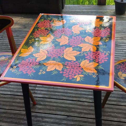 Kaunis yleisilmeeltään siisti kalusteryhmä, johon kuuluu pöytä ja kaksi tuolia. Verhoilut kunnossa, puuosissa pientä kulumaa.