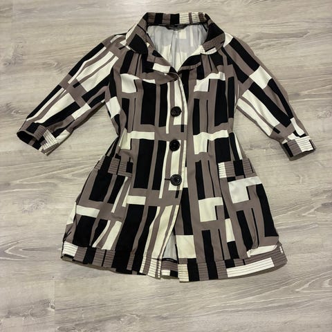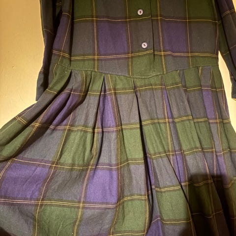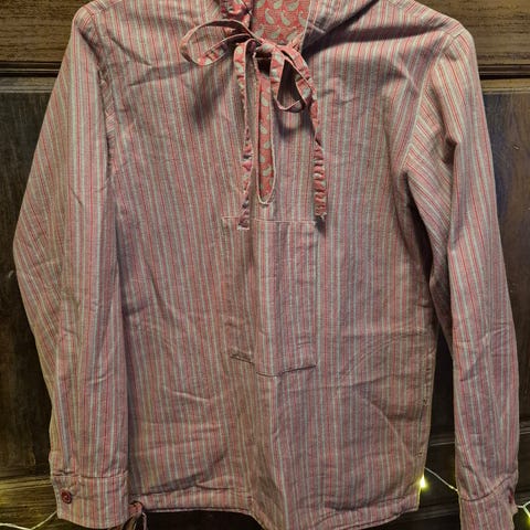 Toisen hihan sauma on auki noin sentin matkalta ja helman tikkaus löysähkö, pientä pintanöyhtää myös (näkyvät kuvissa). Yleisilmeeltään kuitenkin siisti, kirkkaat ja näyttävät värit, ei näkyvää likaa. Pieni M tai S. Noin mittoja löytyy kuvista.