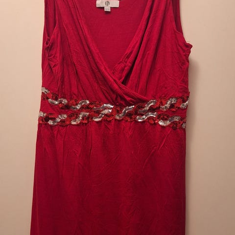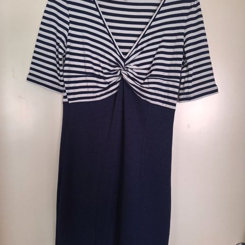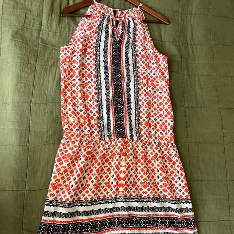 Trikoinen mekko pirteällä kuosilla. Mekon kainalo-kainalomitta on noin 48 cm ja mekon kokonaispituus on noin 90 cm.