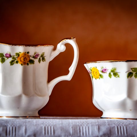 Posliininen antiikki teekuppi ja aluslautanen kukkakuviointi valkoinen