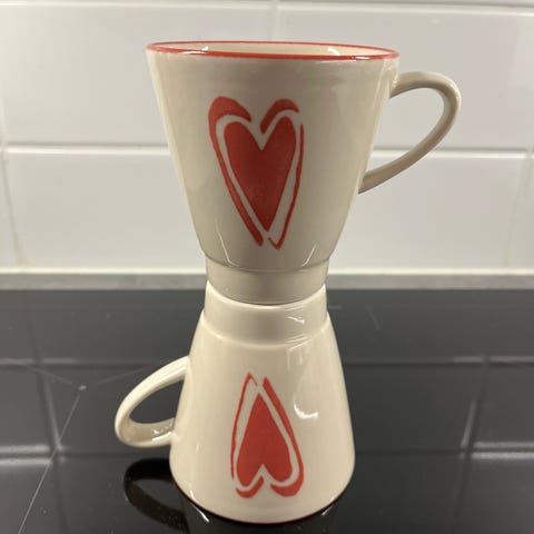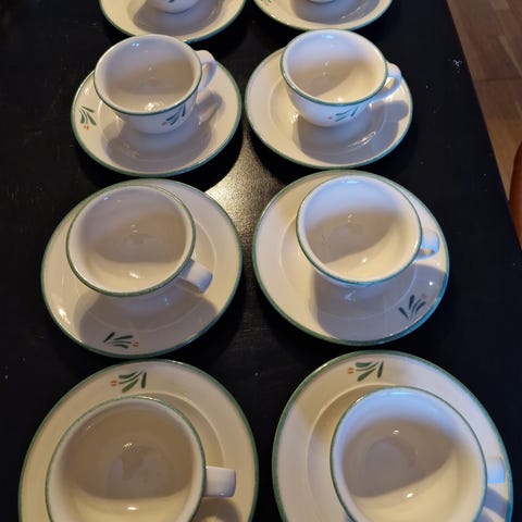 Vähälle käytölle jäänyt kahvikupit, asetit, sokeriastia ja kermanekka