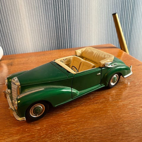 Kuvassa on Mercedes-Benz C-sarjan C180 -mallia muistuttava leluauto. Liikkuu eteen kun vetää renkaita taakse. Kokoa voi verrata kynään mikä on vieressä.