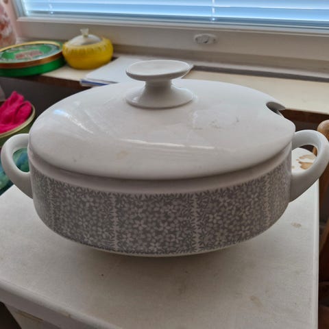 Halkaisija 23.5 cm ja korkeus 10cm. Olli Tasasen suunnittelema ja valmistettu 1970-1975. Valkea posliini ja kultainen kellonauhakuviointi. Kuvassa näkyy rikama yläreunassa, pohjassa marmorointia.