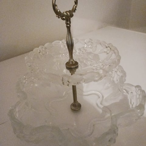 Hyväkuntoinen kerrostarjotin posliinia ja terästä. Tukeva pidike ruuvikiinityksellä, ei keiku. Kokonaiskorkeus 33 cm, ylemmän lautasen halkaisija 21 cm, alemman 28,5 cm. Nouto tai Toridiili.