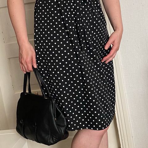 Kuvanmukainen vuoritettu mekko, jossa valkoiset pallot /pilkut. Levenevä helma. Vetoketju sivussa. Perhoshihat.