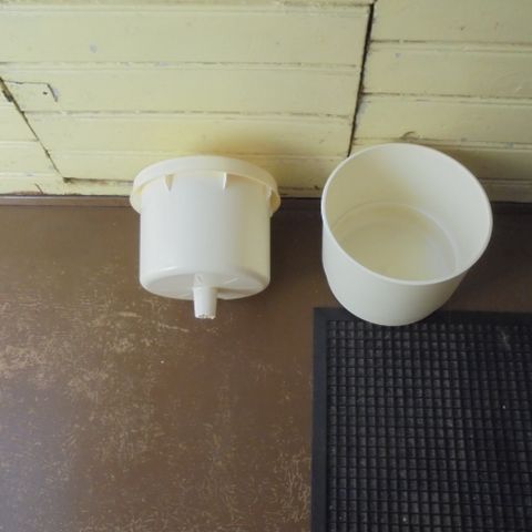 Riippuva kukkaruukku, valmistettu valkoisesta muovista. Varustettu metalliketjulla ripustamista varten. Sisältää mustan muovisen alustan kasveille.