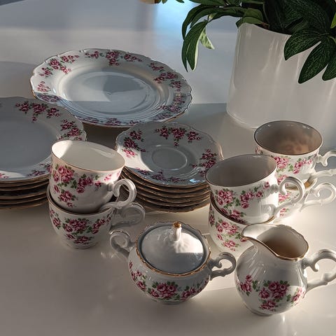 Sisältää kannellisen sokerikon, kermakon, 5 kpl kahvikuppeja, 5 kpl asetteja ja 4 kpl aluslautasia. Suloinen henkäys mummolatunnelmaa!
