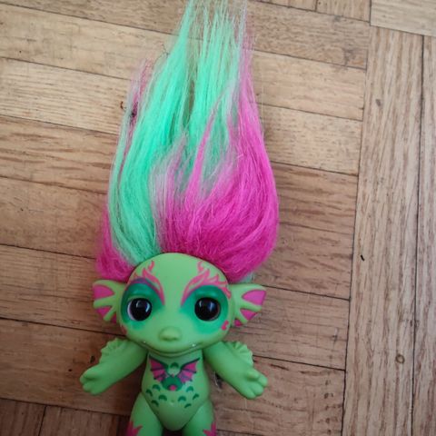 Tämä on peikkonukke, jolle on ominaista tyypillinen ulkonäkö: suuret silmät, hymyilevät kasvot ja kirkkaat, hulmuavat hiukset.
