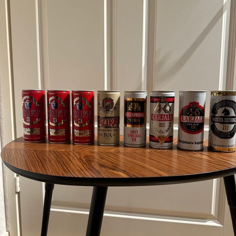 Noin 370 erilaista tölkkiä 1990–luvulta, joukossa myös jokunen vanhempi tölkki.