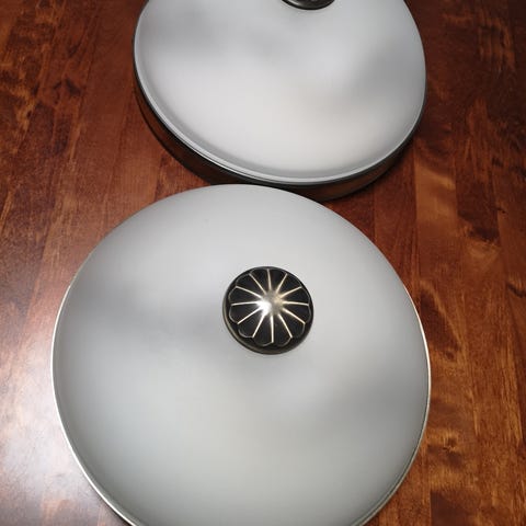 2 täysin samanlaista ja yksi hieman erilainen maitolasilamppu. Ulkonäöltään kolmas myös erittäin lähellä kahta muuta. Kaikkiin sopii yksi e27 polttimo (ei mukana). Halkaisija 30cm. 10e kaikki kolme