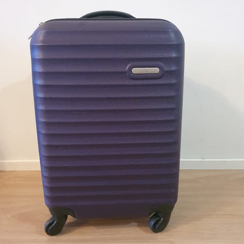 Uusi lentolaukku. Korkeus 51 cm, syvyys 21 cm. Kovapintainen, numerolukko.