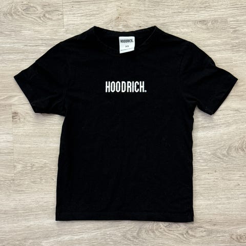 Musta tyttöjen pitkähihainen Hoodrich trikoopaita. Cropattu malli. Koko lasten xl, joka vastaa mielestäni n. kokoa 164 tai xs. Kainalo-kainalo n. 47 cm, olka-helma n. 46 cm ja kainalo-hihansuu n. 45 cm.
