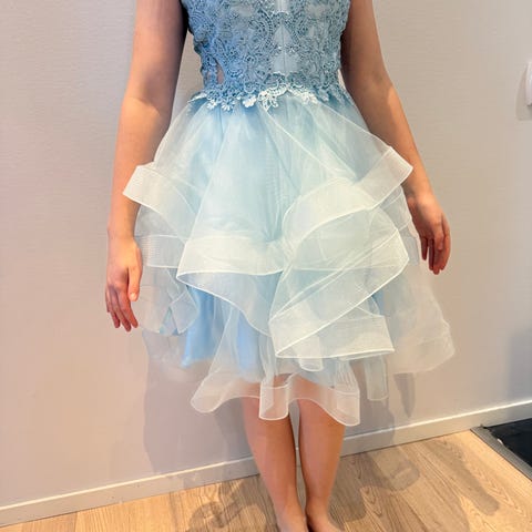 Kerran käytetty kaunis , kirkkaansininen juhlamekko strassikoristeilla ja yhdellä olkaimella koko 34