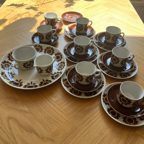 Erikoinen astiasto. 6 kpl isompia ja pienempiä kuppeja lautasineen. Kannu, sokerikko ja kermakko myös isompana ja pienempänä.