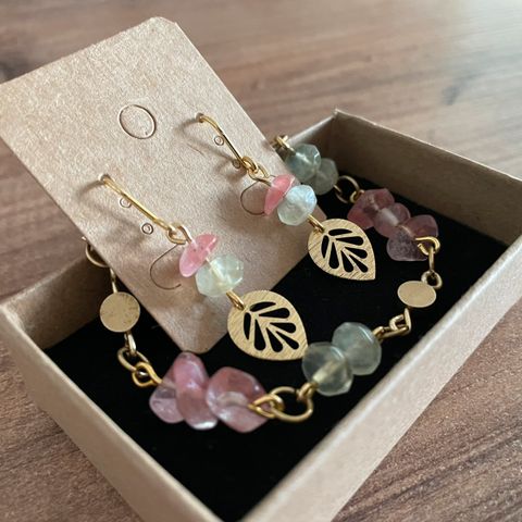 Käsintehdyt korvakorut: messinki, vaaleanpunainen turmaliini, vaaleanvihrea preniitti.