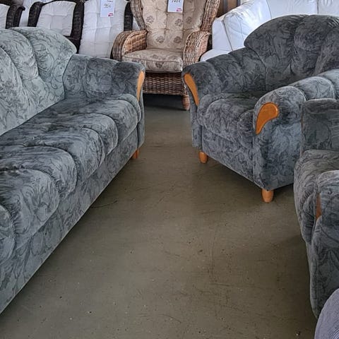 Tyylikäs, huippukuntoinen sohvakalusto. Kolmen istuttava sohva ja kaksi nojatuolia.
