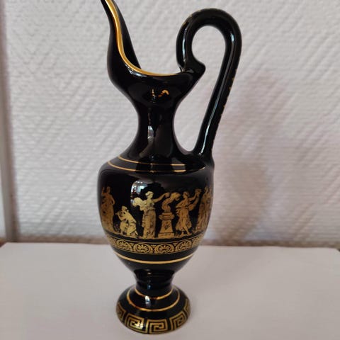 Hieno Kreikkalainen Hand Made antiikki teekannu keramiikkaa, jossa on musta pohjaväri ja kultaiset 24 k koristeet. Kannun kyljissä on klassisia kreikkalaisia kuvioita. Sopii sekä koriste-esineeksi että käytännölliseen käyttöön teetä tarjoillessa. Kannun mitat kork n. 16,5 cm, ymp 46 cm