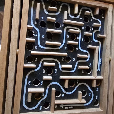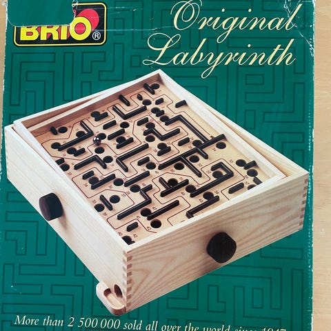 Nostalginen labyrinttikuulapeli. Mukana kaksi kuulaa. Kunto on hyvä, eli kaikki toimii. Laatikko hieman kulunut, mutta siinä on kantokahva tallella.