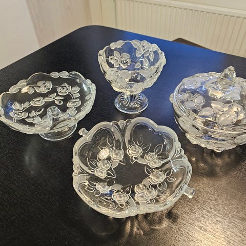Lasinen tarjoilukulho ja -astiat 6 kpl. Hyvässä kunnossa.