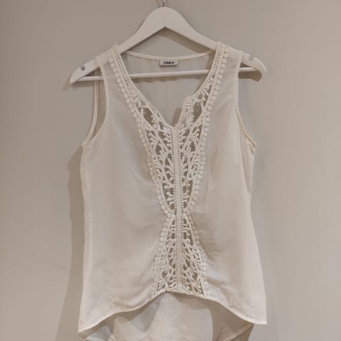 Ril's valkoinen toppi pitsihelmalla, 38. Kainalo-kainalo 52cm, päälliskankaan olka-helma 64cm. Pitsihelma tulee vähän pisemmälle. Pk 6,90.