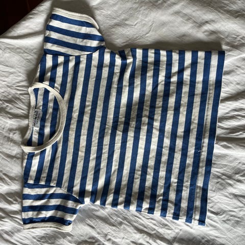 Marimekko musta-valkoinen klassikko raitapaita lyhyillä hihoilla koko 70 cm. Koko on reilu. Paitaa on käytetty vain muutaman kerran. Se on muutoin mielestäni lähes uudenveroinen, mutta oikealla puolella erotan hyvin haalean tahran. Tästä kuva.