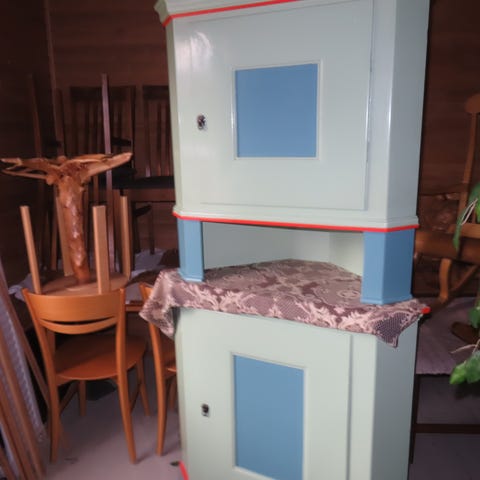 Vanha pieni kaappi, nurkkamalli 1900-luvun alkupuolelta, kunn0stettu ja maalattu perinnesävyin, siisti myös sisältä h. 120e