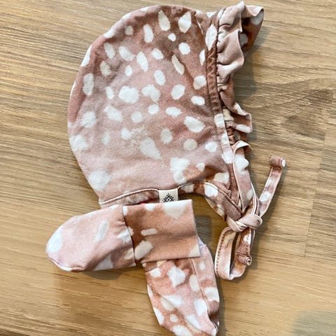 Vauvan myssy, beige/vaaleanruskea ja vihreitä pilkkuja. (En muista tämän kuosin nimeä.)