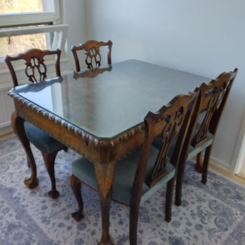 Chippendale-pöytäryhmä kunnostettavaksesi? Jos pintojen pienet naarmut ja muu kuluma eivät haittaa, voit antaa tälle kokonaisuudelle uuden elämän suht pienellä vaivalla eli saumat kiristämällä ja vaikka istuinten kankaat uusimalla.