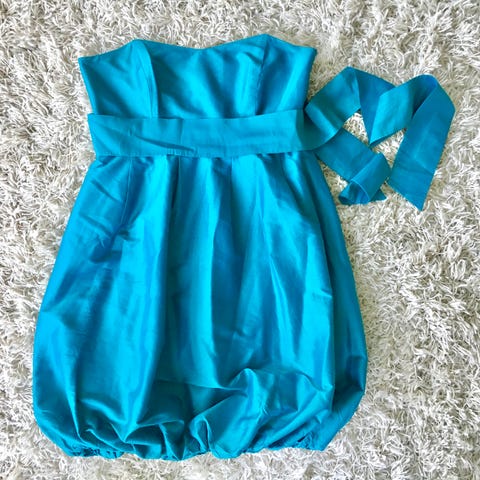 Kerran, kaksi päällä käynyt mekko. Kaunis, kimaltelevainen vaaleansininen kangas.