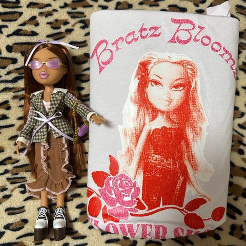 Nuken mukana tulee myös oversize-mallinen Bratz-T-paita, joka on universaalia kokoa tytölle tai naiselle (ei siis nukenvaate).