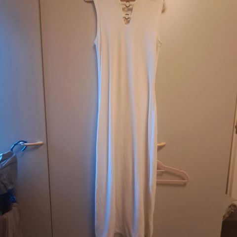 Sopiva n.165–170 cm pituiselle. Itse olen 167 cm pitkä (kuvissa), ja mekko istuu kauniisti – lyhyemmällä voi jäädä liian pitkäksi ilman lyhennystä, joten älä anna pienen koon hämätä! Sävy vaihtelee vähän valon mukaan vihreämmästä harmaampaan. (Kuvat salamalla ja ilman.)