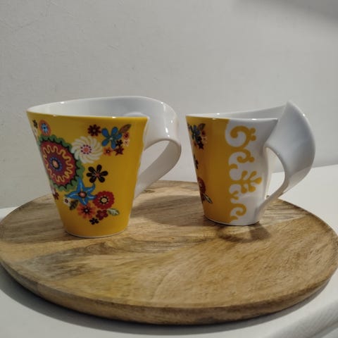 Myytävänä kuin uudet mukit 2kpl ja salaattilautaset 2kpl. Mukin korkeus 11cm ja lautanen 24x24cm