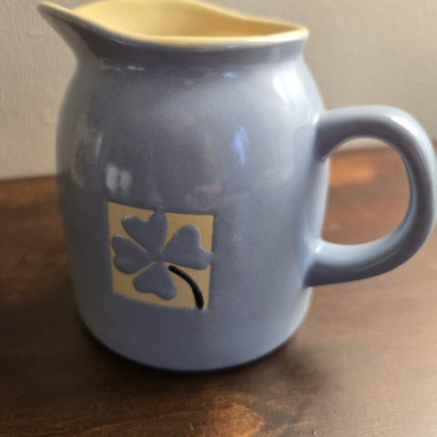 Kermakannu on koristeltu kukkakuvioin ja siinä on kultareunus.