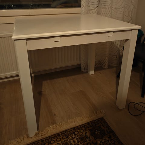 Kokopuinen ruokapöytä. Pöydässä jonkin verran kuumien astioiden aiheuttamia jälkä lakassa (katso kuva), mutta muuten se on toimiva ja vankka. Hiomalla ja lakkaamalla saisi uuden veroisen.