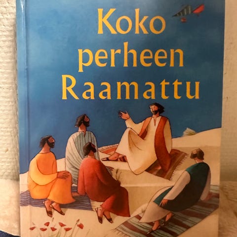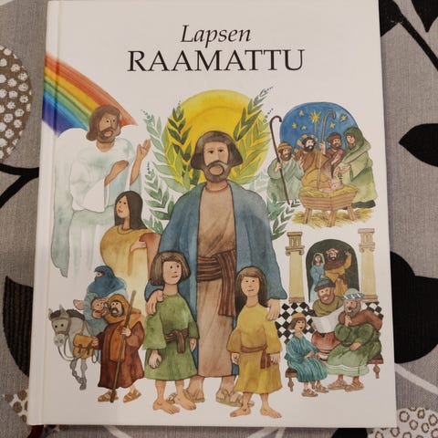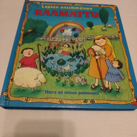 Pienille lapsille "Pienen oma Raamattu",jossa paksut pahviset sivut, joita on pienenkin lapsen helppo kääntää. Erittäin hyvä kunto, vain pieniä naarmuja kansissa. Nämä tulleet säilytyksessä. Sivut moitteettomassa kunnossa. Ei ole varmaan kuin kerran pari selailtua.