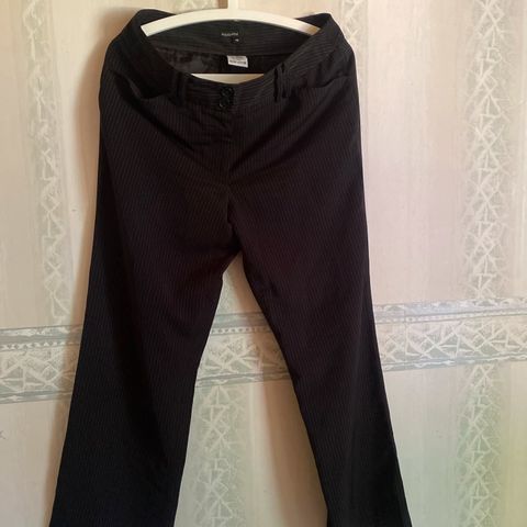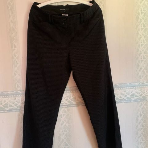 Mustat nilkkapituiset liituraitahousut koossa L (sopivat mielestäni paremmin M-kokoiselle). Joustava collegetyyppinen materiaali on nukkaantunut käytössä.