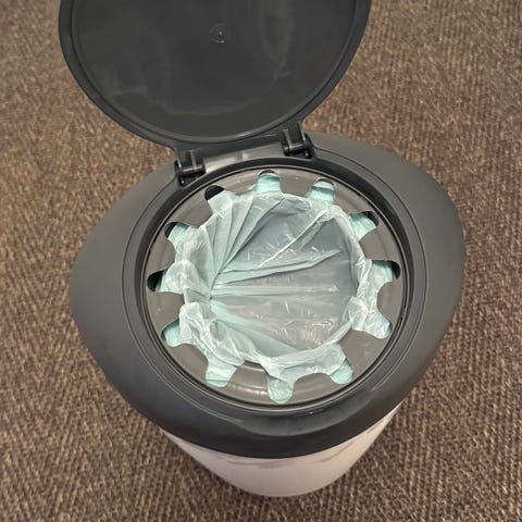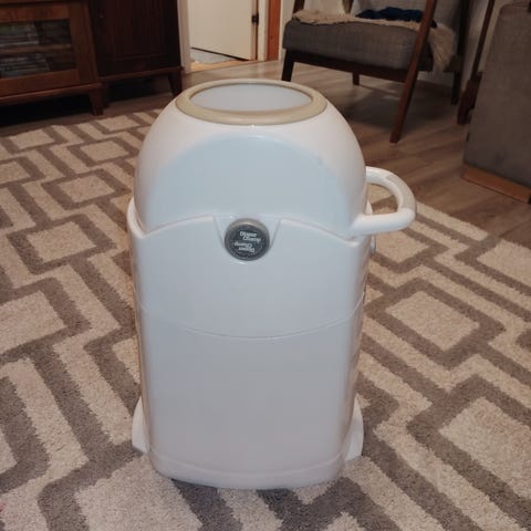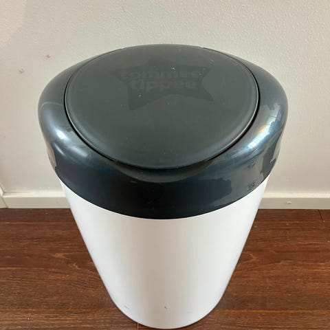 Valkoinen vaipparoskis. Mahdollisuus ostaa omat vaippapussit, jotka saa pyöräytetty kiinni ja siten yksittäispakattua kaikki vaipat. Toimii myös normi pussilla tavan roskiksena, melko tiivis, että hajut pysyy sisällä.