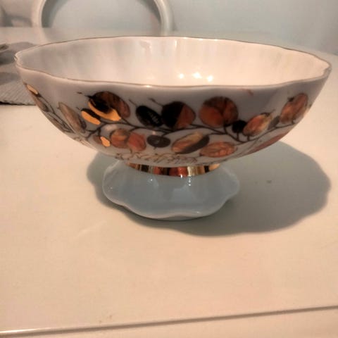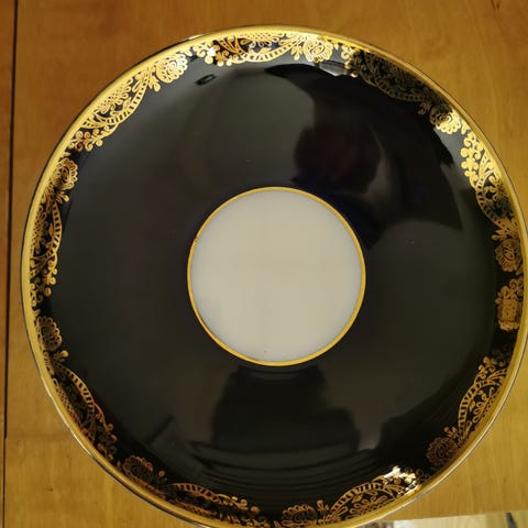 Ehjä isohko kulho, kultaus ok, sopii valkoiseen kattaukseen. Kunto hyvä, leima on mutta kuluneet,tietyssä valossa nähtävissä. Nouto tai postit.